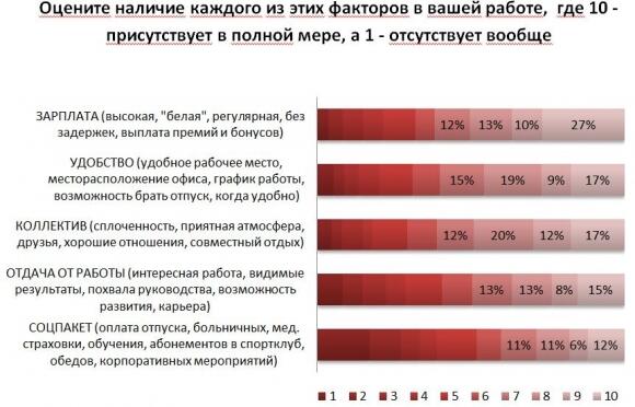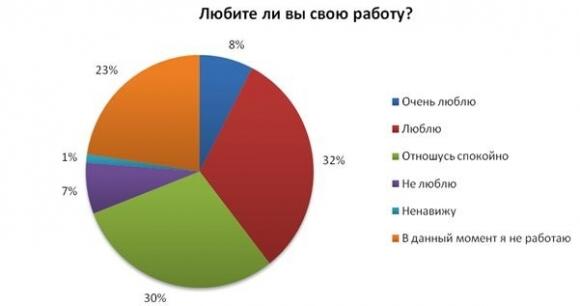 Согласно исследованию rabota.ua, большинство опрошенных относятся к ежедневно исполняемым обязанностям с любовью. Только один процент, — каждый сотый украинец — ненавидит работу, а еще треть относится к ней без определенного негатива или восторга. «Что самое интересное, это не зависит от должности, профессиональной сферы или заработка. В одном офисе за соседними столами могут сидеть два человека, которые заняты одинаковым делом, и один может любить свою работу, другой – ненавидеть», — сказала нам Пашкина.