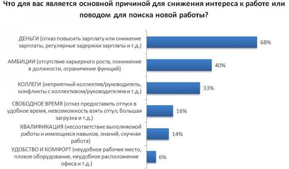Но без денег любовь быстро проходит. По данным опроса, при постоянных задержках зарплаты или неудовлетворяющей работника сумме гонорара любовь к работе со временем утрачивают 86% опрошенных. Вторая по значимости причина, по которой украинцы готовы разлюбить работу — нереализованные карьерные амбиции (40%), на третьем — козни коллег и некомфортная обстановка в коллективе (33%).