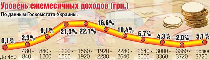 Госкомстат распределил население Украины по уровню среднедушевых доходов в месяц. Оказалось, что девятая часть украинцев имеют доходы ниже 1200 грн. в месяц (менее 40 грн. в день), притом что прожиточный минимум в нашей стране в 2014 году составляет 1176 грн. в месяц.
