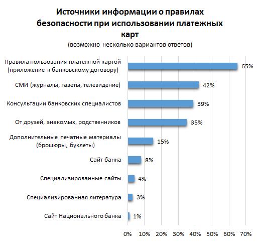В качестве источника информации о безопасности использования платежных карт лидируют правила пользования, предоставляемые банком как приложение к договору об открытии и обслуживании карточного счета: их назвали 65% респондентов, которые ознакомлены с информацией о безопасности использования платежных карт. Кроме правил пользования платежными картами, предоставляемых банком вместе с договором, держатели получают информацию о средствах защиты от мошенничества из СМИ (42%), от банковских сотрудников (39%) и друзей и знакомых (35%). Только 8% респондентов получают такую информацию на официальных страницах банков в интернете.