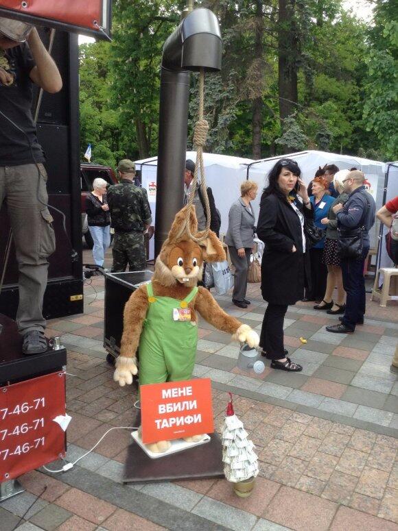 В Украине нарастает протестное движение против повышения тарифов на услуги ЖКХ. Так, 14 мая представители профсоюзов и общественных организаций из разных регионов Украины принесли под стены парламента золотую батарею и гильотину. Также возле парламента установили сцену с плакатом «Остановим повышение тарифов».