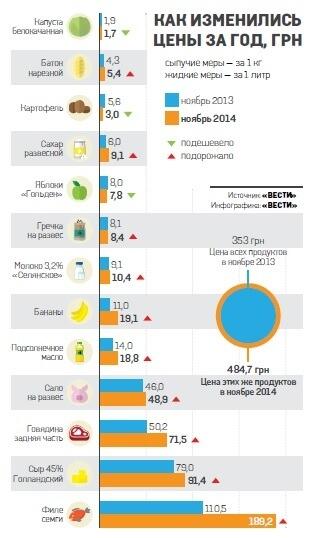 Цены идут на взлет вслед за падением гривни. Еще до решения Нацбанка отпустить курс нацвалюты и последовавшего затем скачка «зеленого», в октябре, Госстат сообщил о повышении стоимости быттехники в среднем на 19,8%. Одежда и обувь подорожали на 10,9%, услуги ЖКХ почти на треть, алкоголь и табачные изделия «потяжелели» на четверть от прежней цены. Дороже всего стал бензин. По официальным данным, топливо подорожало более чем наполовину.