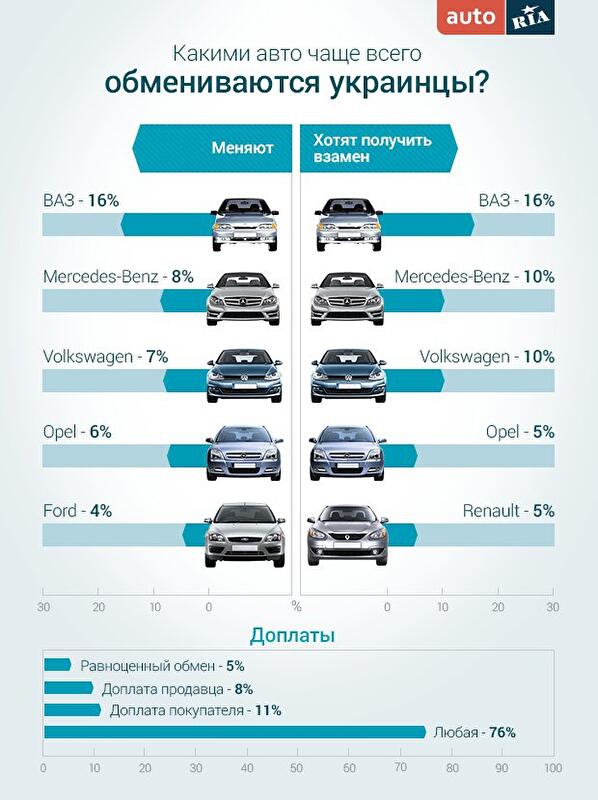 В 2014 году все больше украинцев готовы обменивать свои авто вместо продажи. Так, по данным AUTO.RIA.com , с начала года количество желающих обменять свой автомобиль на другое авто выросло на 3% в сравнении с 2013.