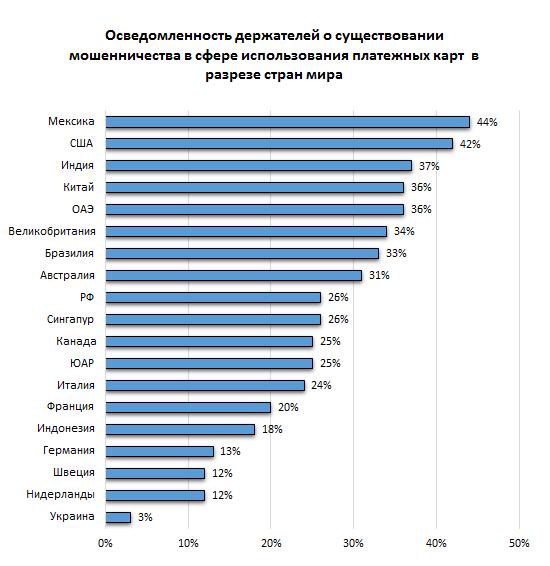 По данным исследования, наибольший уровень личного столкновения держателей платежных карт с мошенничеством зафиксирован в Мексике и США – 44% и 42% респондентов соответственно. Немного ниже уровень личного столкновения граждан с платежным мошенничеством в Индии – 37% опрошенных.