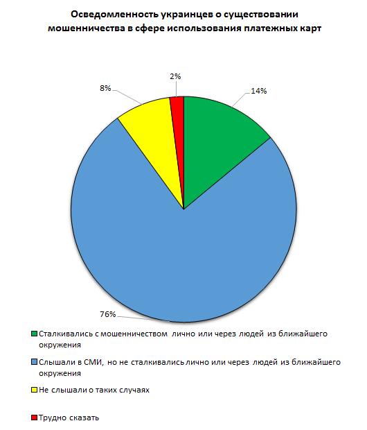 Результаты исследования показали достаточно высокую информированность украинцев о существовании мошенничества в сфере использования платежных инструментов – 90% респондентов знают об этом явлении. При этом 14% опрошенных сталкивались с тем или иным видом мошенничества на собственном опыте, либо на опыте людей из ближайшего окружения (родственники, друзья, знакомые).