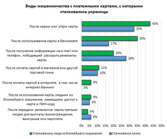 Среди наиболее распространенных видов мошенничества держатели платежных карт назвали мошенничество после кражи или потери карты (44%), мошенничество после использования в банкомате (33%) и виды мошенничества, которые относятся к социальной инженерии (23%).