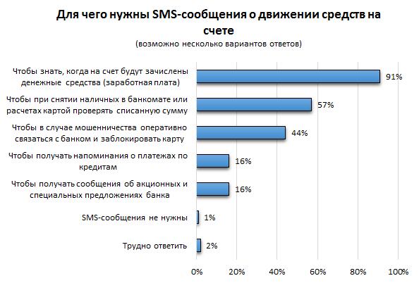 Так, SMS-информирование в большей мере используется держателями для контроля движения денежных средств по карточным счетам: 91% опрошенных считает, что SMS-сообщения для оповещения о поступлении денег на счет; 57% держателей думает, что SMS необходимы, чтобы при получении денег в банкомате или расчетах в торговой сети или интернете проверить, правильно ли была списана сумма.