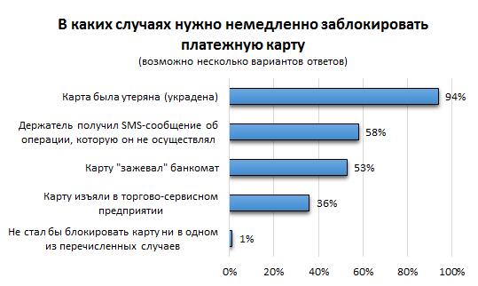 По данным исследования, лишь 58% респондентов считает получение SMS-сообщения с описанием транзакции на указанный номер мобильного телефона об операции, которую держатель не осуществлял, поводом для срочного обращения в банк с заявлением о блокировке карты; тогда как в случае утери карты блокировать ее намерено 94% опрошенных.