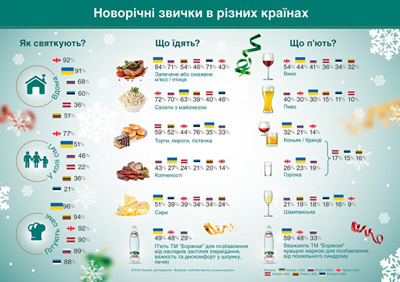 До начала новогодних застолий – если, конечно, не считать праздничных корпоративов – остается немногим более недели. Традиционно считается, что на постсоветском пространстве Новый год встречают примерно одинаково: звоном бокалов с шампанским, праздничным оливье и прочими привычными разносолами. Однако, как показывает исследование гастрономических привычек, проведенное в рамках Социальной инициативы ТМ «Боржоми» по развитию гастрономической культуры в Украине, не все так однозначно. И если в одних странах главенствовать на столе действительно будут салаты с майонезом, то в других первое кулинарное место займет домашняя выпечка и мясо. Основываясь на результатах опроса, «Комментарии» сравнивают праздничные столы в Украине, Грузии, России, а также прибалтийских странах – Латвии, Литве и Эстонии.