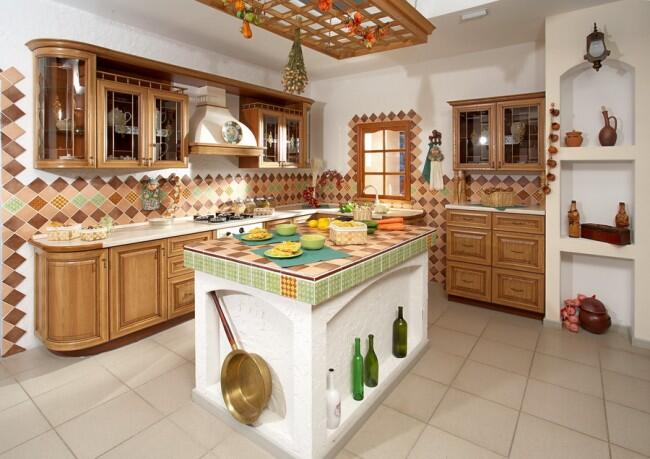 Украсить кухню можно при помощи декоративной посуды, которая обычно изготавливается из дерева или глины. На обеденный стол и подоконник ставят глиняные вазы, разукрашенные изображениями подсолнухов, маков или калины. Не менее популярны здесь такие изделия, как глиняные крынки, горшки, тарелки и фигурки, изображающие людей или животных. Рабочую зону можно декорировать при помощи резных деревянных столовых приборов и расписанных узорами разделочных досок.