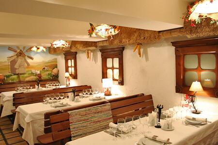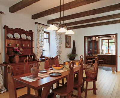Для напольного покрытия рекомендуется применить ламинат с имитацией фактуры натурального дерева; линолеум или керамическую плитку. Непременный атрибут такого интерьера – это старинная печь или ее имитация. При желании, в роли очага может выступить электрический камин, декорированный под старину или вытяжной колпак на кухне, расписанный в украинском стиле. Основная особенность мебели в таком дизайнерском решении – это простота и максимальная функциональность. Здесь должен присутствовать деревянный стол, имеющий прямоугольную или круглую форму; массивные скамейки с декоративной резьбой, а также навесные шкафы, изготовленные из грубых, необработанных досок.