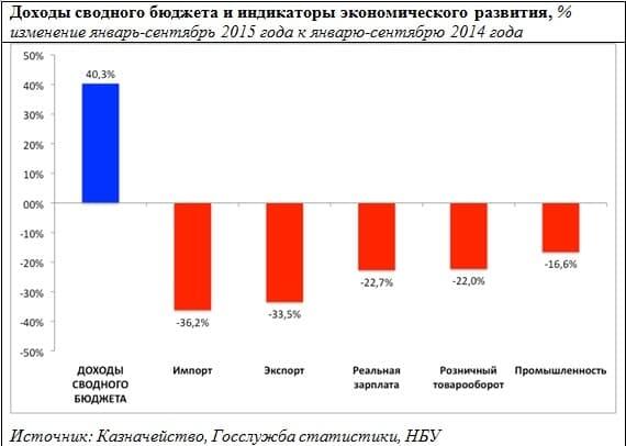 Судите сами. Если бы обменный курс гривны к доллару остался на прошлогоднем уровне (январь-сентябрь 2014 года 11,12 грн/долл), то поступления в бюджет от НДС на импорт в этом году сократились бы на 48 млрд.грн. По факту же, за счет девальвации гривны до 21,6 грн/долл (в среднем за январь-сентябрь) доходы от НДС на импортные товары увеличились на 24,7 млрд.грн по сравнению с прошлым годом.