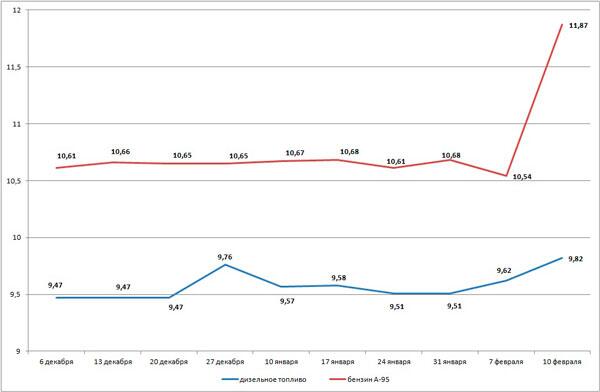 Украинские светлые нефтепродукты готовятся установить новый рекорд — цена на них замерла буквально в нескольких копейках от рекордной. Всего за одни выходные цена на бензин марки А-95 подскочила на 1 гривну 33 копейки: с 10 гривен 54 копеек за литр 7 февраля до 11 гривен 87 копеек 10 февраля. Дизельное топливо за эти дни тоже подорожало: с 9 гривен 62 копеек за литр до 9 гривен 82 коппек.