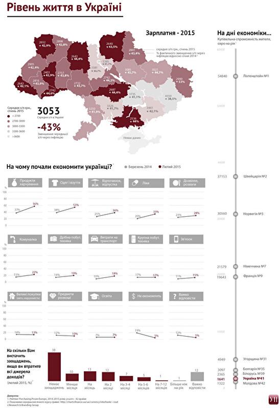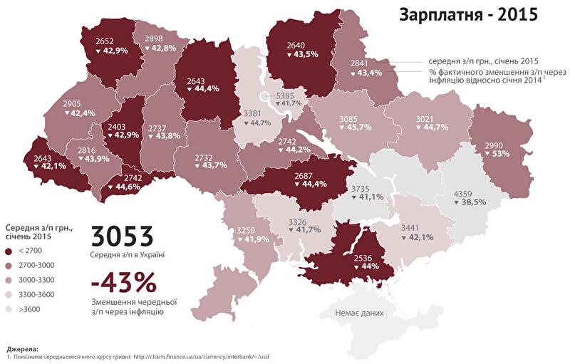 Більше того, доходи знижуються, про що свідчить навіть офіційна статистика. За даними Держстату, у січні 2015 року середня зарплата зменшилася у різних галузях. У сільському господарстві - з 2 869 грн до 2 482 грн, у фінансовій та страховій сфері - з 8 171 грн до 7 192 грн, в освіті - з 3 064 грн до 2 542 грн.