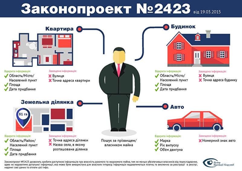 Хочемо нагадати, що минулого року Верховна Рада України ухвалила закон № 4728, яким зробила можливим пошук інформації в реєстрі нерухомості по квартирам та будинкам, але виключно за об’єктом пошуку. Сьогодні, ввівши адресу квартири, чи будинку в пошуковику, можна отримати інформацію про те, хто є власником нерухомості. Після прийняття законопроекту №2423, можна буде отримати ж інформацію про те, чим володіє кожна особа, але без прив’язки до адреси.
