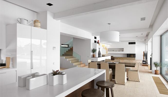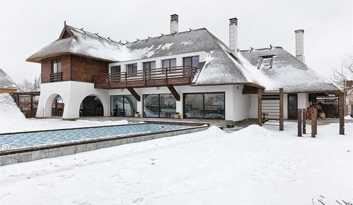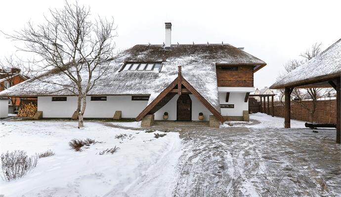 Первый этаж дома занимает просторная и светлая гостиная — с печью и камином, зонами кухни и столовой; в левой части этажа сгруппированы гардеробная комната, кладовая, санузел и технические помещения. На втором этаже находятся приватные комнаты: две детские, ванная, кабинет-студия и блок помещений большой спальни. Аллюзии на традиционную мазанку проведены тонко, почти неуловимо. Точно найден баланс между стилистически-безошибочным узнава-нием (украинская хата!) и предельно современным, абсолютно в контексте мировых тенденций, общим Ясная структура внутреннего пространства читается при входе: первый этаж — большая светлая гостиная; на втором расположены восприятием интерьера. В равной степени впечатляет экстерьер. Дом покрыт высокой крышей из камыша. Стены (как снаружи, так и внутри) отделаны авторской штукатуркой, воссоздающей эффект мазанки, и выкрашены в белый цвет. Ограда участка представляет собой тын с зарослями дикого винограда, и только от дороги усадьба ограждена забором из тонких жердей. Возле главных ворот, в соответствии с давним украинским обычаем, установлен высокий деревянный шест с колесом наверху — приглашение для аистов свить гнездо С восточной стороны к дому прилегают погреб-«курган» со скифской бабой на вершине и площадка для мангала.