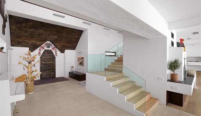 Применение архаичных отделочных материалов, адаптация идей народной архитектуры к требованиям комфортной жизни в ХХI веке, по-научному глубокое переосмысление целых пластов национального культурного наследия — работа, проделанная авторами проекта, проявляет суперсовременную идентификацию украинского архетипа жилья.