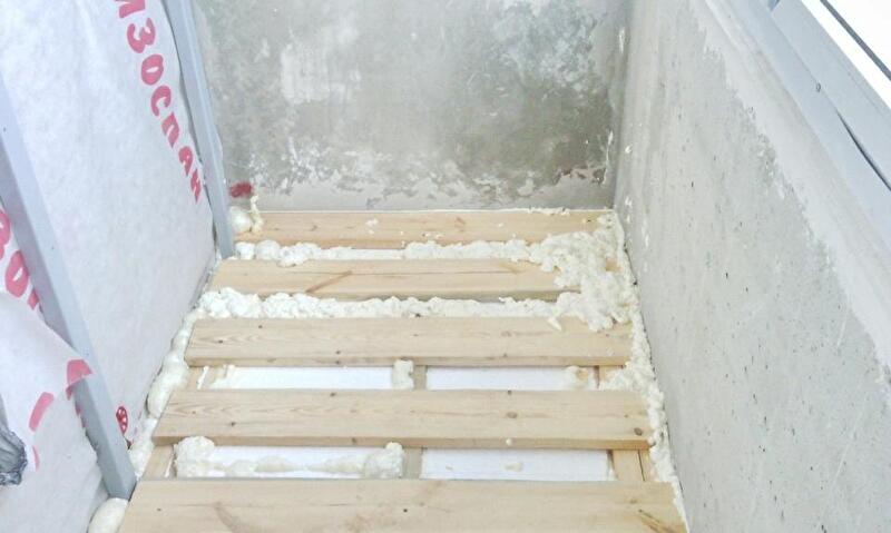 Поверх лаг укладывается лист ДСП с зазором от стен по 50-100 мм. ДСП также крепится саморезами. Все стыки и зазоры, образовавшиеся в процессе укладки, также запениваются.