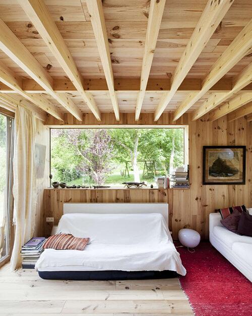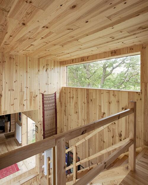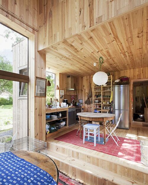 В авангардном жилье, чья площадь равна 110 квадратным метрам, в десять раз просторнее, чем в в типичном трейлере. Стены и носящие конструкции здания практически полностью выполнены из легкой древесины, что позволяет не только легко монтировать, но и переносить дом на новое место. Строение представляет собой несколько коробок-комнат, которые переходят одна в другую. Большое количество скрытых полок и шкафов не только экономят место, но и подчеркивают просторность жилища. Главным декоративным элементом внутренней отделки стала фактура дерева, которую архитекторы храбро оставили видимой, не только на стенах и потолке, но и на полу.