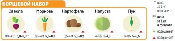 Ингредиенты борщевого набора за январь накинули в цене до 50 копеек, кроме капусты, которая подорожала на 1,5 грн/кг. Причина — уменьшение предложения во время праздников (из-за выходных селяне не вышли на рынки). Что касается капусты — то в январе на складах закончилась эра переизбытка этого овоща, спрос-предложение выровнялись, цены пошли вверх.
