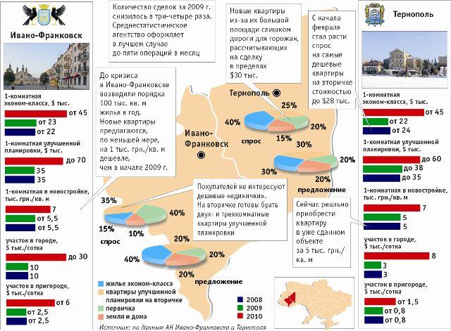 Тернопольские риэлторы, в отличие от своих ивано-франковских коллег, отмечают рост спроса на самое доступное жилье. По словам директора местного АН «Проспект» Марии Стацишин, с начала февраля число потенциальных покупателей увеличелось на 20%. Эксперт поясняет активизацию клиентов отложенным спросом, ведь в течение последнего года в городе практически ничего не продавалось, поскольку все ожидали дальнейшего снижения цен. Но так как с лета стоимость жилья не изменилась, а по рынку поползли слухи о его возможном удорожании, то имеющие накопления потенциальные покупатели все же стали подыскивать квартиры. Продажи жилья подтолкнуло и возвращение на родину заробитчан, потерявших работу в Греции и Испании из-за обострившихся там экономических проблем. Директор АН «Світ» Оксана Тлумацкая говорит, что наибольшим спросом у них пользуется самая дешевая вторичка — однокомнатные квартиры стоимостью до $28 тыс. (гостинки, хрущевки и полногабаритные квартиры в отдаленных микрорайонах Кутковцы и Оболонь). Уловив такую тенденцию, хозяева стали повышать цены: за последний месяц они выросли на $1–2 тыс.