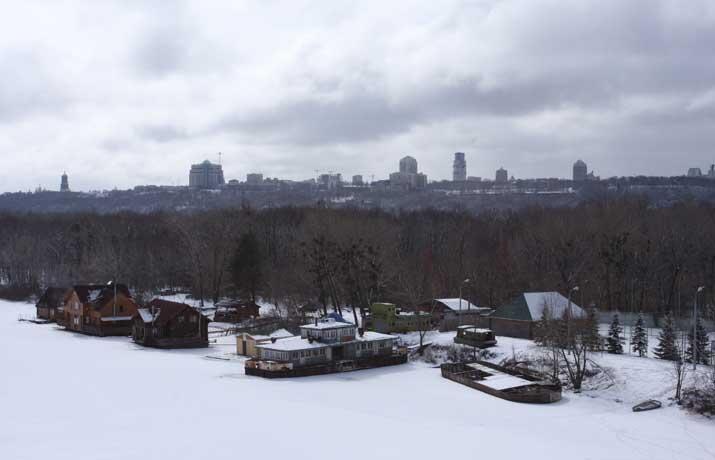 Вид с моста на 25-ю линию Русановских садов, часть которой уже снесли.