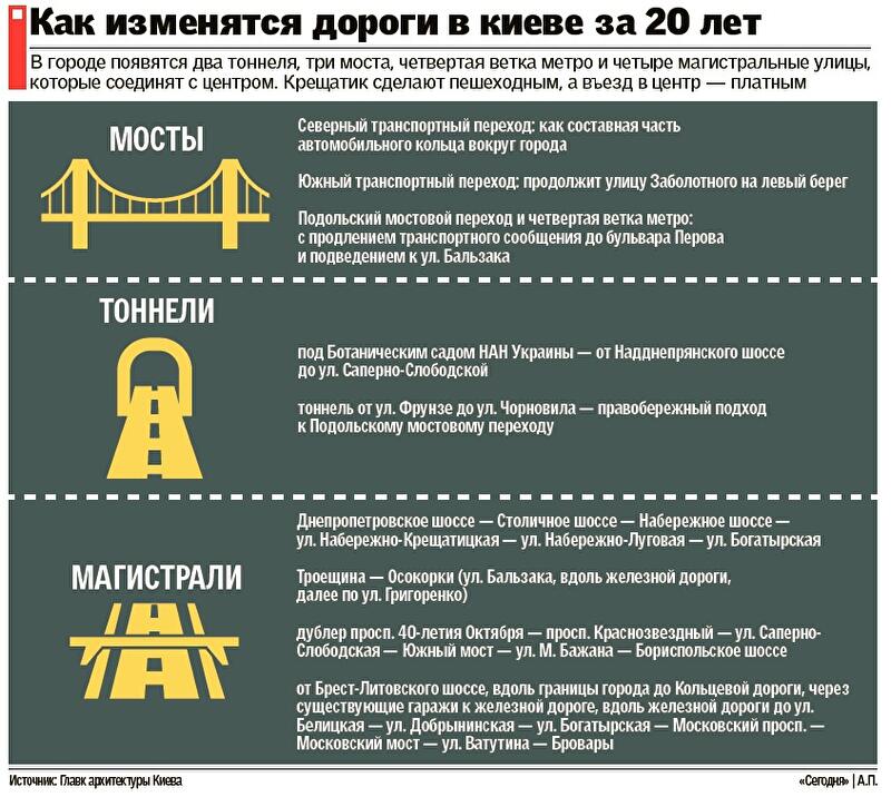 У городских властей — «наполеоновские» планы по развитию дорожно-транспортной инфраструктуры Киева. Как выяснила «Сегодня», в ближайшие 5—20 лет в Киеве может появиться несколько тоннелей, новые мосты через Днепр и магистрали. «Протяженность магистральной уличной сети увеличится почти в 1,5 раза, будет эффективнее использоваться ее пропускная способность. Исчезнут пробки на перекрестках, уменьшатся автомобильные потоки в центральной части города, будет достигнута безопасность транспортного и пешеходного движения», — делится планами замдиректора департамента градостроительства и архитектуры Андрей Ваврыш. Миллиарды гривен, которые нужны на новые дороги, столичная власть хочет взять у государства и инвесторов.