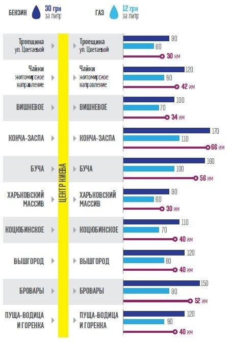«Вести» посчитали, что при нынешних ценах на бензин поездка на авто на работу в центр города и обратно для жителей отдаленных районов (Троещина, Харьковский) обойдется в 90–100 грн (зависит от мощности и состояния авто, а также дорожной обстановки), а для людей из пригорода обойдется уже в 160–170 грн. Правда, чиновники, которые ездят из Конча-Заспы в Киев, пользуются более мощными машинами, так что и расходы у них больше (от 300 грн только за проезд «дом-работа-дом» на своей машине и еще 300–400 грн — на авто охраны).