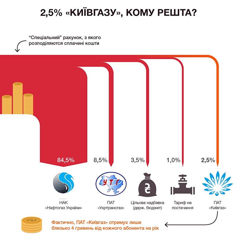 В компании рассказали, что счет, который указан на квитанции, является специальным, и предприятие не может распоряжаться этими средствами. Деньги, которые перечисляют киевляне в счет уплаты газа, поступают в НАК «Нафтогаз Украины» в размере около 85%, в ОАО «Укртрансгаз» - в размере 8,5%, целевая надбавка (гос. бюджет) - 3,4%, банк - 1% и в ОАО «Киевгаз» в размере всего 2,5%. Фактически ПАО «Киевгаз» получает лишь около 4 гривен от каждого абонента в год.