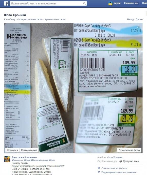 Свежий пример: киевлянка Анастасия К. в соцсети поделилась своим случаем: покупала два кусочка импортного сыра, и на кассе оказалось, что надо заплатить почти на 20 гривен больше. «Цена — 21,78 грн, к оплате — 31,74 грн. И еще кусочек. Одним махом 20 грн. Почему супермаркеты не любят своих клиентов?» — пишет девушка. «Вести» без труда нашли и другие подобные случаи. Оказалось, что если раньше суммы несоответствия могли были относительно небольшими, то сейчас они существенно увеличились. «Это не первый случай, но мы закрывали глаза, когда речь шла об 1–2 гривнях, но 20 — это уже слишком», — подтверждает Анастасия.