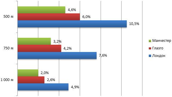 Исследование показало, что покупатели недвижимости в Лондоне переплачивают в среднем 10,5 % за то, чтобы поселиться в радиусе 500 м от метро. В денежном выражении надбавка составляет 42 тыс. фунтов стерлингов по отношению к стоимости типичного жилья. Если станция удалена еще на 250 м, цена падает на 10 тыс. фунтов. При расстоянии 1 500 м наценка исчезает вовсе.