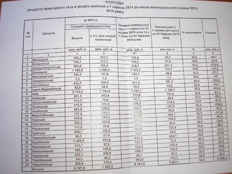 По плану, каждая из областей получит ровно на 30% меньше газа для потребностей населения и теплокоммунэнерго, чем годом ранее. Согласно документу, попавшему в распоряжение редакции, существенней всего, на 0,5 млрд кубометров, планируют сократить потребление в Киеве – с 1,7 млрд «кубов» до 1,2 млрд куб. м. К слову, экс-министр топлива и энергетики Украины, а ныне главы наблюдательного совета « Киевэнерго » Иван Плачков недавно говорил, что для нормального прохождения отопительного сезона в столице всегда «сжигали» около 4 млрд. кубометров (это, правда, и с учетом промышленности).