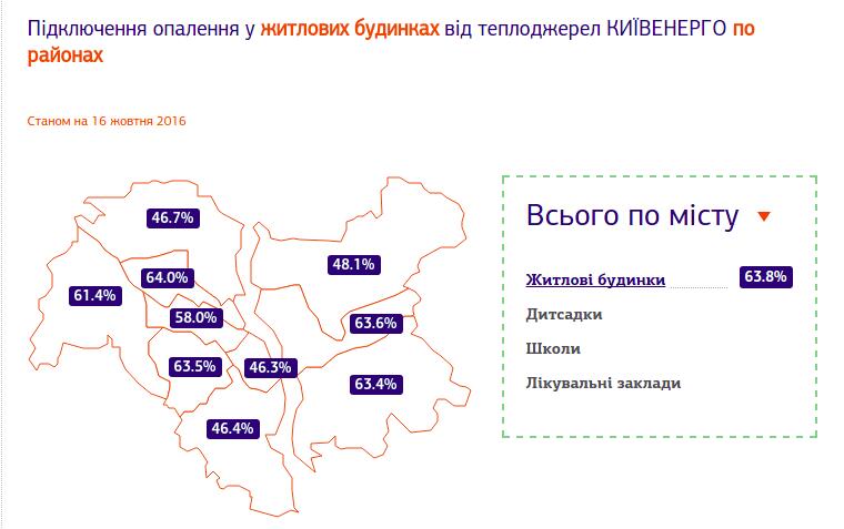 Як стало відомо Domik.ua , на ранок 16 жовтня теплом забезпечено вже 64% осель киян, або понад 6 тис. будинків. «Найбільше – у Дарницькому та Подільському районах міста. Соціальна сфера підключена майже повністю. Тепло вже у 99% столичних дитсадків, 97% шкіл та 92% лікарень», - повідомили в компанії.