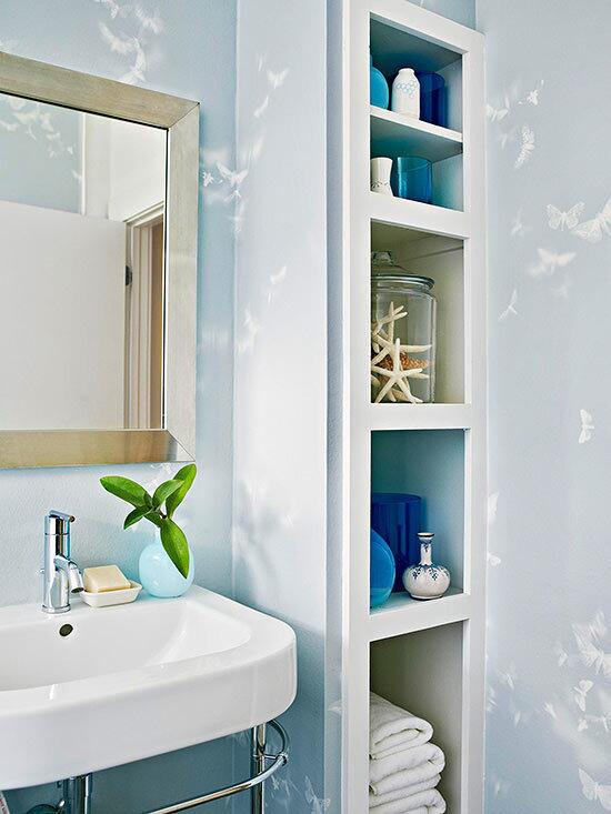 Системы хранения в ванной не должны загромождать пространство. Откажитесь от больших шкафов и ящиков в пользу невесомых полок над ванной, легкого стеллажа в нише или вместительной корзины под раковиной. Не забудьте о внутренней стороне двери и фасадов шкафчиков – на ней можно разместить крючки.