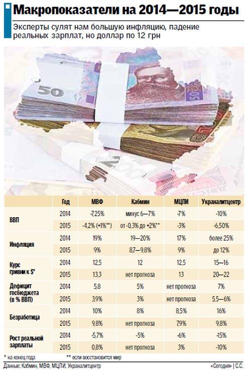 ЖИЗНЬ НАРОДА. Экономисты считают, что, несмотря на снижение ВВП и рост цен, говорить об обнищании населения в этом и следующем году не придется, хотя жизнь безусловно станет сложнее. «Зарплаты и пенсии останутся на прежнем уровне. Подорожают импортные товары, прежде всего нефтепродукты, бытовая техника, цитрусовые, бананы, кофе, чай — прогнозирует аналитик МЦПИ Александр Жолудь. — Из-за дорогого доллара окажется малодоступным отдых за границей. Но главный удар по кошельку нанесут услуги ЖКХ, так как МВФ требует за два года поднять тарифы на «коммуналку» до уровня рентабельных (сейчас платим примерно половину себестоимости. — Авт.) как одно из условий получения траншей кредита». По его словам, изменится жизнь среднего класса: субсидии на квартплату им не положены, бензин подорожал, цены на технику растут. Но украинские продукты массового потребления вырастут в цене ненамного. По мнению Охрименко, потерпеть придется до конца 2015 г., затем ситуация улучшится. Естественно, при условии окончания войны. Рост экономпоказателей в следующем году, в частности сравнительно небольшую инфляцию, эксперты связывают с надеждами на установление мира на Востоке и финпомощью Запада, которые дадут толчок экономике, ростом торговли с ЕС после вступления в силу Соглашения об ассоциации, а в перспективе и налаживанием торговых отношений с РФ. Эксперт обещает в 2016 г. нулевой рост ВВП, но невысокую (до 10% инфляцию) и небольшое повышение зарплат до 3% (на 100—120 грн). Рост ВВП Украины в 2016 г. на 2—3% прогнозирует и МВФ. В Фонде обещают увеличить объем помощи Украине с нынешних $17 млрд до $19 млрд и выше, но при условии выполнения их требований: наращивание золотовалютного резерва НБУ, увеличение тарифов по ЖКХ, оптимизация госаппарата, выполнение госбюджета.