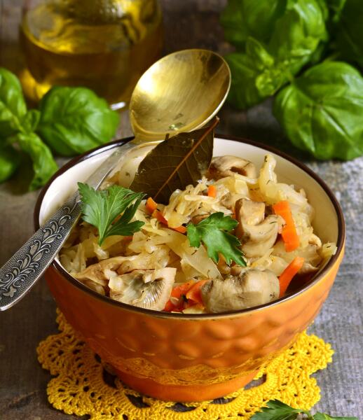 - Квашеную капусту выложить на дуршлаг, промыть под струей проточной воды. Залить капусту грибным бульоном, тушить до готовности. В конце тушения к капусте добавить вареную фасоль и грибы, залить сметаной. Добавить специи, посолить по вкусу, тушить еще 10–15 мин.