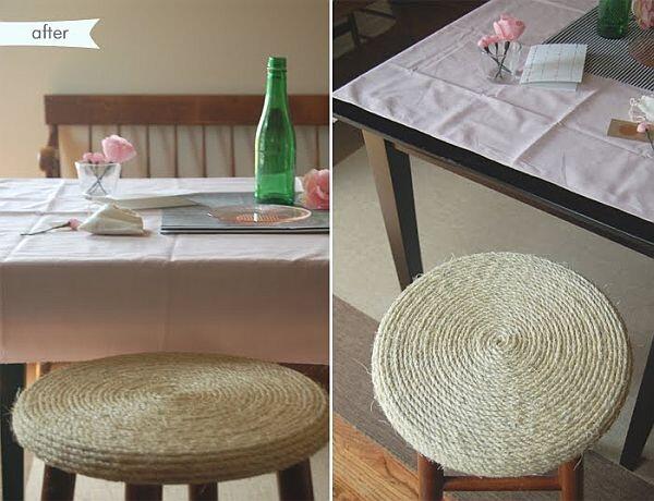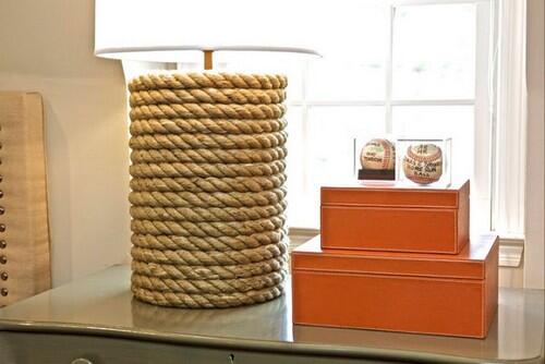 Еще одной оригинальной идеей использования веревки и каната в оформлении дизайна интерьера — это обмотка уже существующих предметов. Если вам жалко расставаться с любимым прикроватным столиком, но ни одна покраска внешнего вида не меняет, тонкий канат или веревка смогу спасти положение! Для этого вам понадобится канат, клей и ловкость рук. Немного времени, усидчивости и новый стол с восхитительной текстурой станет украшением вашей спальни. Точно так же вы сможете продлить жизнь многим предметам мебели.