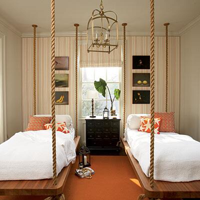 - Оригинальные идеи с подвешиванием. Желаете почувствовать себя юнгой? Используйте канаты в качестве креплений для кровати. Такое оформление внесет нотки оригинальности в спальню, а такие кровати в детской комнате вызовут восторг у ваших ребятишек. Необычной станет и полочка или стеллаж, подвешенный на канате: основная идея — соединение полочек с помощью каната. Сюда же можно отнести качели, плетеные кресла, фонари для освещения.