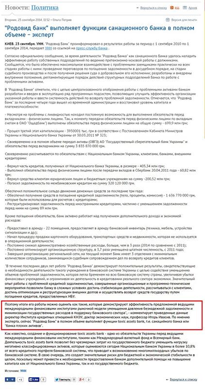 Как известно, Минфин, владея 99,9% акций "Родовода", является, грубо говоря, его начальником и хозяином. И вот когда хозяин говорит, что санационный банк не заработал, сам "Родовид" у себя на сайте пишет: он заработал как санационный.