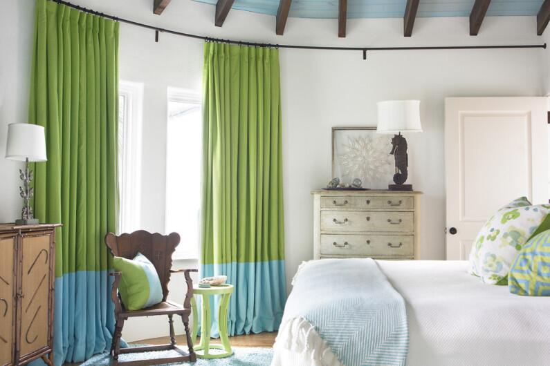 - Откройте оконный проем пошире, а шторы повесьте полегче, выбирая светлые тона ткани: голубой, белый, кремовый, нежно-зеленый, светло-желтый, серебристый с зеленым. Особенно хорошо они будут выглядеть, если спальня расположена на северной стороне дома.