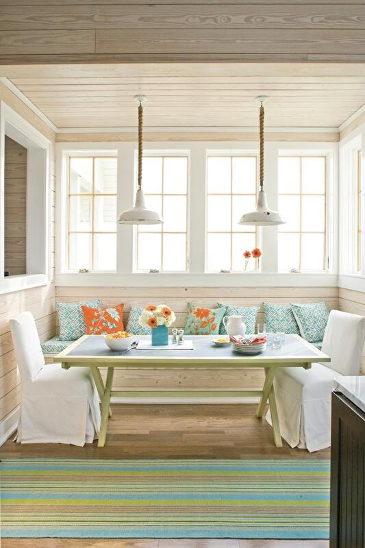 Скатерти — хлопковые или из полиэстера — светлые, с тонким флористическим узором, прихватки и полотенца, салфетки в нежной пастельной гамме. На окна повесьте бамбуковые ролеты или легкие, функциональные занавеси из полиэстера (подойдут, также, римские конструкции из тюля). Можно сшить съемные чехлы для стульев и табуретов.