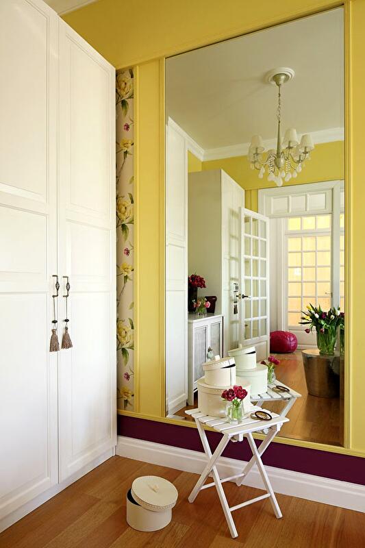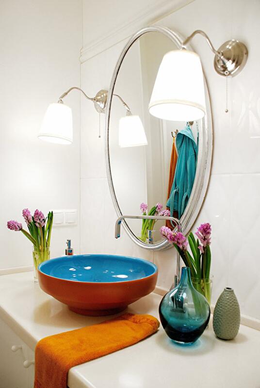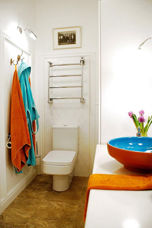 Что касается перепланировки, дизайнер ограничился минимальными изменениями: перегородку между кухней и коридором убрали, объединили санузел, выставили по одной оси дверные проемы в ванную и гостиную. Благодаря этому в ванной комнате удалось установить купель, а в гостиной поместить гардеробный шкаф.