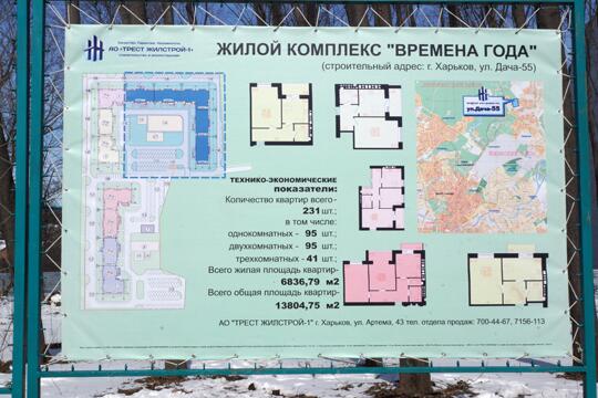 Общая площадь нового жилого квартала - 2,89 га. Всего в жилом комплексе «Времена года» по ул. Дача, 55 - 626 квартир. В первых секциях, возведенных в прошлом году, четверть квартир приобретено харьковчанами благодаря поддержке государства. Реализация этого проекта позволяет гражданам приобрести доступное жилье по цене на уровне 5 200 грн. за 1 кв. м, что в среднем на треть ниже среднерыночной цены квадратного метра жилья в Харькове. К тому же, покупатели доступного жилья имеют возможность получить льготный ипотечный кредит под 3% годовых (с 16% по кредиту, которые предоставляются банками, 13% компенсирует государство) или компенсацию в размере 30% стоимости квартиры по программе доступного жилья «30/70».