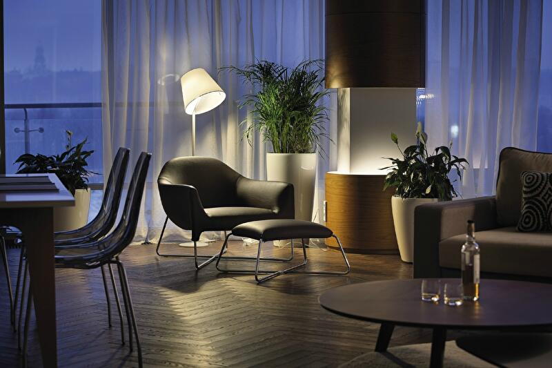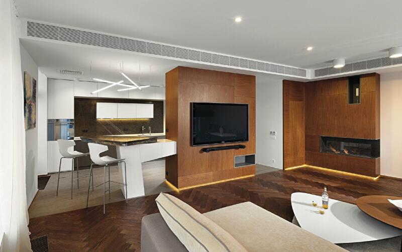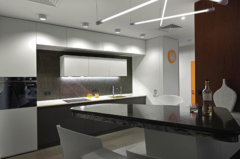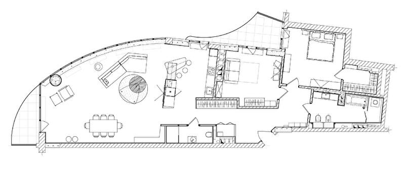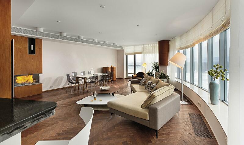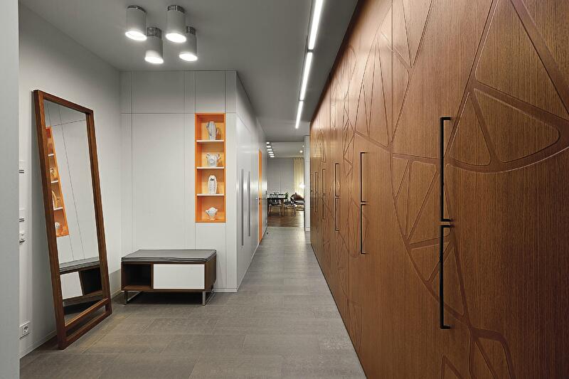 Практикующие архитекторы знают: любая проблема в работе с проектом – это хороший повод сделать нечто неординарное. Новый объект Константина Орловского может послужить отличной иллюстрацией. Специфика изначальной планировки спровоцировала целый ряд планировочных, конструктивных и эстетических разработок, сформировавших особенный характер этой квартиры. Например, чтобы увеличить площадь спален и в то же время увязать линии транзитов с новой архитектурой, в стены были встроены системы хранения – которые стали одной из главных «фишек» интерьера. Также нестандартного подхода к формированию интерьерной композиции требовала радиальная дуга в плане гостиной – практически полностью остекленная скругленная стена. Подход был найден: мебельные группы «оторваны» от стен и образуют автономные тематические зоны – столовую и диванную группы, комфортное место для чтения. Пришлось побороться также и за свет. В отличие от гостевой территории, где естественного освещения в избытке, удаленные вглубь квартиры помещения требовали дополнительных ресурсов. Так появились скрытые подсветки, деликатно рисующие пространство, и графичные светильники-линии, как будто указывающие направление движения.