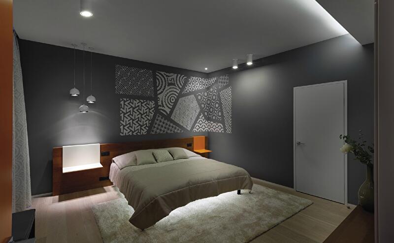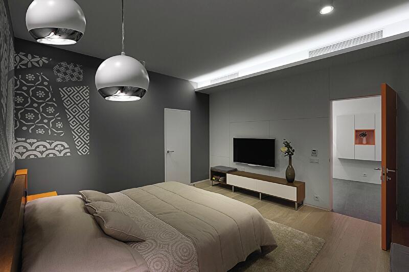 Остроумной находкой в оформлении коридора, ведущего из прихожей в гостевую зону, стали фасады встроенной системы хранения. Нанесенный на них рельефный рисунок нивелирует монотонность четырехметрового шкафа, превращая его почти в арт-объект. Любовь к графике проявилась и в оформлении стен спальни – на них нанесен рисунок-печворк, состоящий из фрагментов множества орнаментов. Неожиданный паттерн интригует и привносит слегка богемное настроение в сдержанный, по-скандинавски монохромный интерьер спальни.