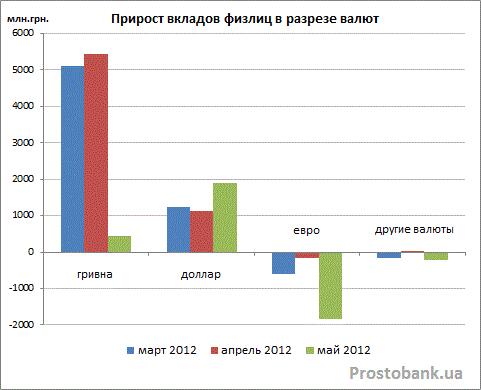 В частности, объем депозитов в долларах в мае-2012 вырос на эквивалент 1905 миллионов гривен, или вчетверо больше, чем объем гривневых вкладов. Общее же снижение объема валютных депозитов произошло из-за уменьшения гривневого эквивалента вкладов в евро почти на ту же сумму – на 1852 миллиона гривен или почти на 6% из-за снижения официального курса НБУ. Также на 209 миллионов гривен уменьшился и объем вкладов в других валютах.