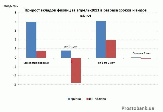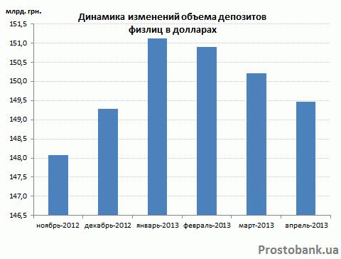 По данным Ассоциации Украинских Банков из 133 исследуемых финансовых учреждений каждый четвертый банк закончил апрель-2013 с отрицательными показателями прироста депозитов физлиц. В частности, 34 банка испытали отток срочных вкладов физлиц, а 12 из них потеряли более 10 миллионов гривен.