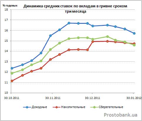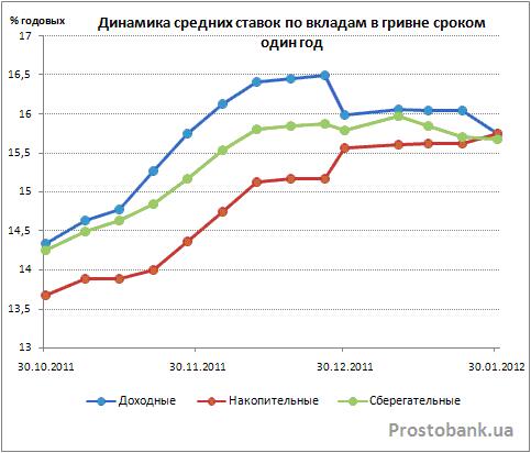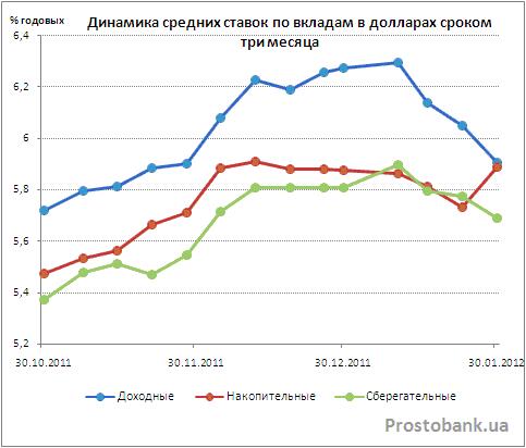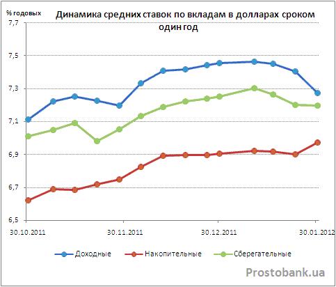 А непосредственной темой сегодняшнего обзора стало неожиданное изменение ставок по депозитам украинских банков в январе-2012. За этот месяц средние депозитные ставки от банков из числа 50-ти лидеров по активам успели радикально сменить направление своего движения и немного снизиться - на 0,1-0,7 процентного пункта по вкладам в гривне и на 0,06-0,37 процентного пункта по депозитам в долларах.
