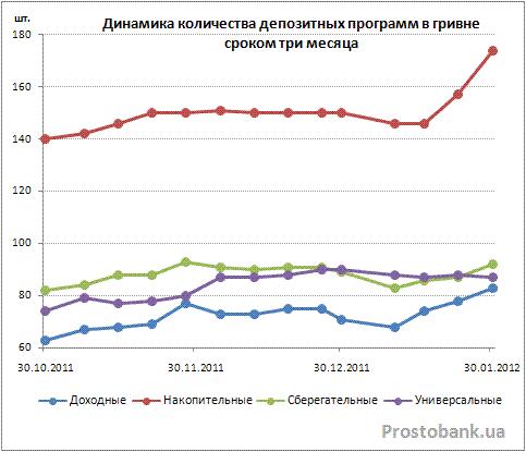 В частности, количество накопительных депозитных программ в гривне сроком на три месяца выросло за январь на 24 предложения – до 174-х, тогда как предложение их ближайших «конкурентов» – доходных вкладов – выросло лишь на 12 программ (до 83-х), а универсальных – вообще уменьшилось на три.