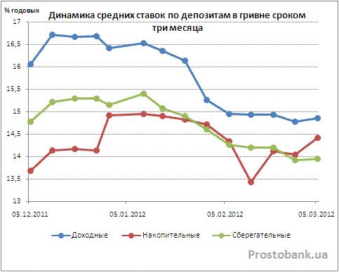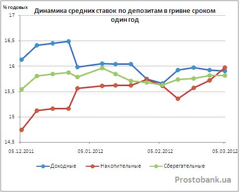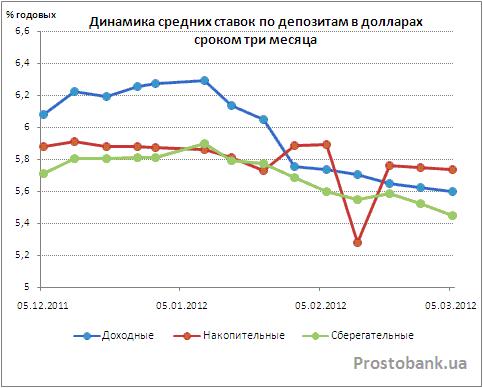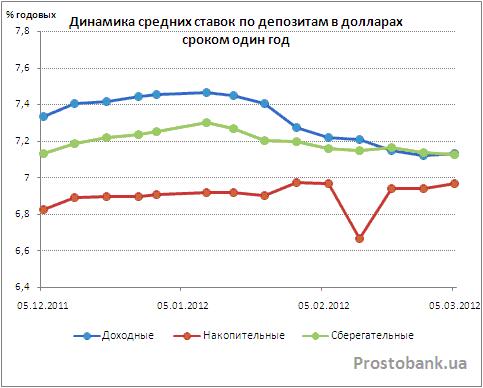 В начале же марта-2012 по гривневым вкладам банки из числа 50-ти крупнейших предлагают ставки до 22,7% годовых при суммах от 700 гривен и сроке один год (банк «Финансовая инициатива»). По депозитам в долларах в начале весны можно получить не более 10% годовых при сумме вклада от 200 долларов и сроке год-полтора (Еврогазбанк) или при сроке полгода и минимальной сумме от 5000 долларов (банк «Таврика»).